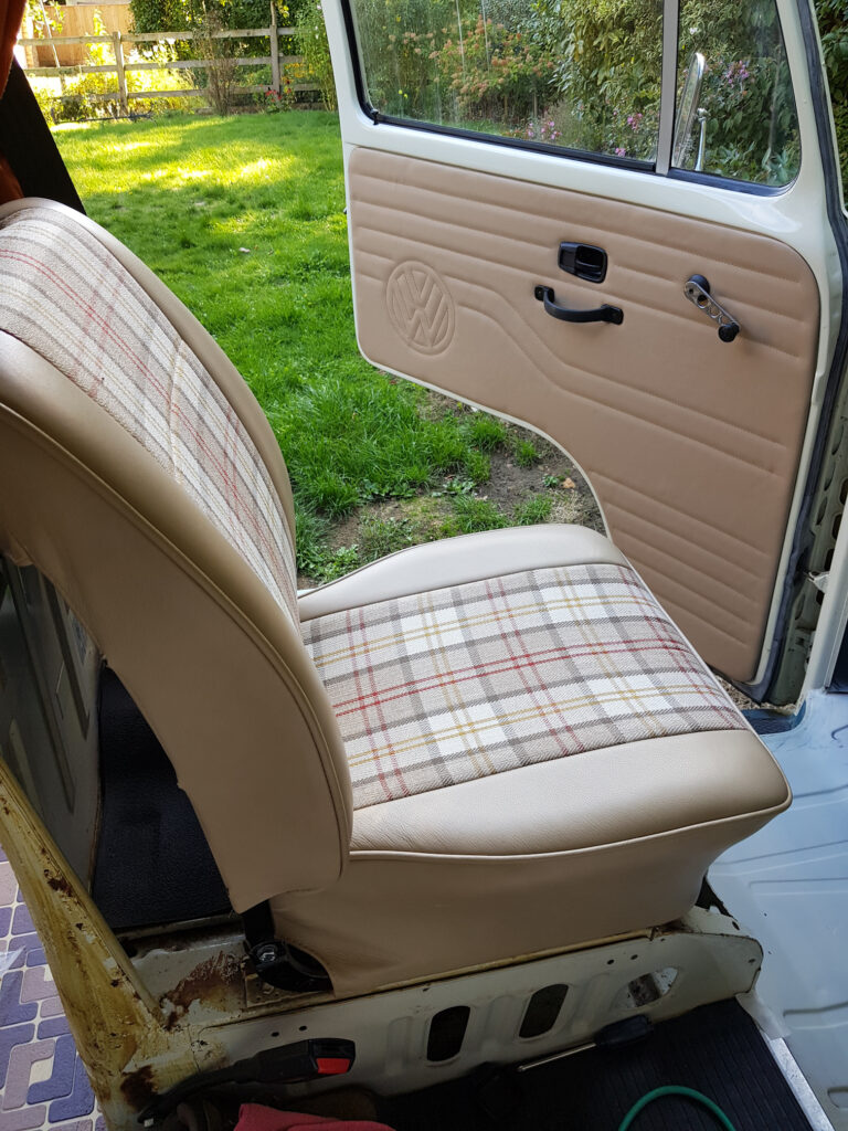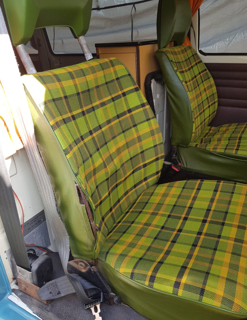 The drivers seat was very uncomfortable as I was sitting directly on the springs, not sure where the padding had gone. I stripped the front seats down and cleaned them up, having to straighten the frame and weld it where it had broken. Our local car upholsterer recovered them in leather and a fabric I found which was similar to the 70’s original style for a Devon conversion (not a Westie). Must be good as she said everyone who went to her workshop liked the material. (Note, I found it first !!).