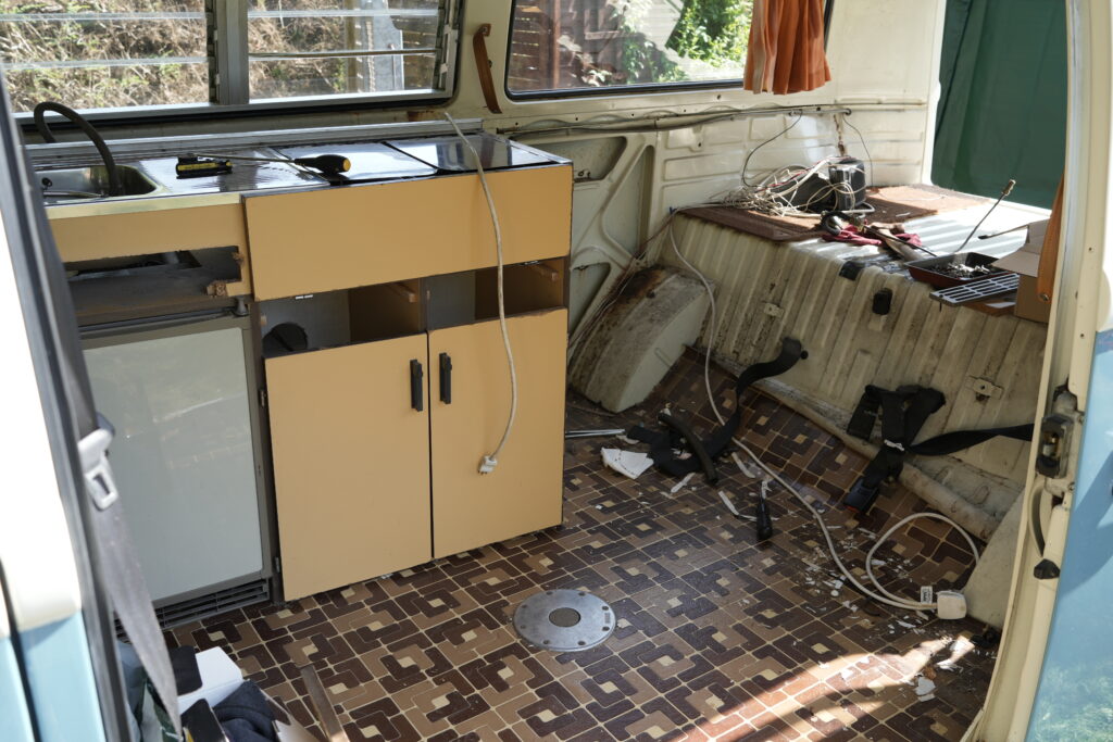 Well, a few outings later and the chipboard cupboards had clearly suffered previously through damp, wear and tear and 45 years of camping. So out with the interior starting with the seats.