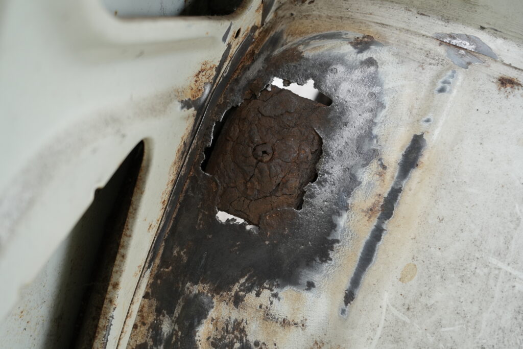 The outer repair needs some work. It was seems to be an old repair and the new paint has not stuck well to some areas of filler so there are a few bubbles along the edge. Now cracking and rusting.