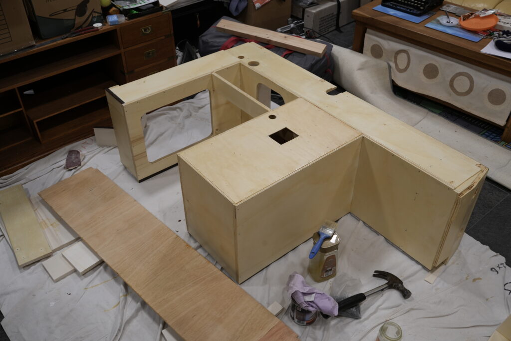 Not much space to get everything in. This is the first unit that incorporates the fridge, hob/grill and sink. It’s work in progress so watch this space. The back and inside is varnished and the outside will be similar to the original yellow and brown.