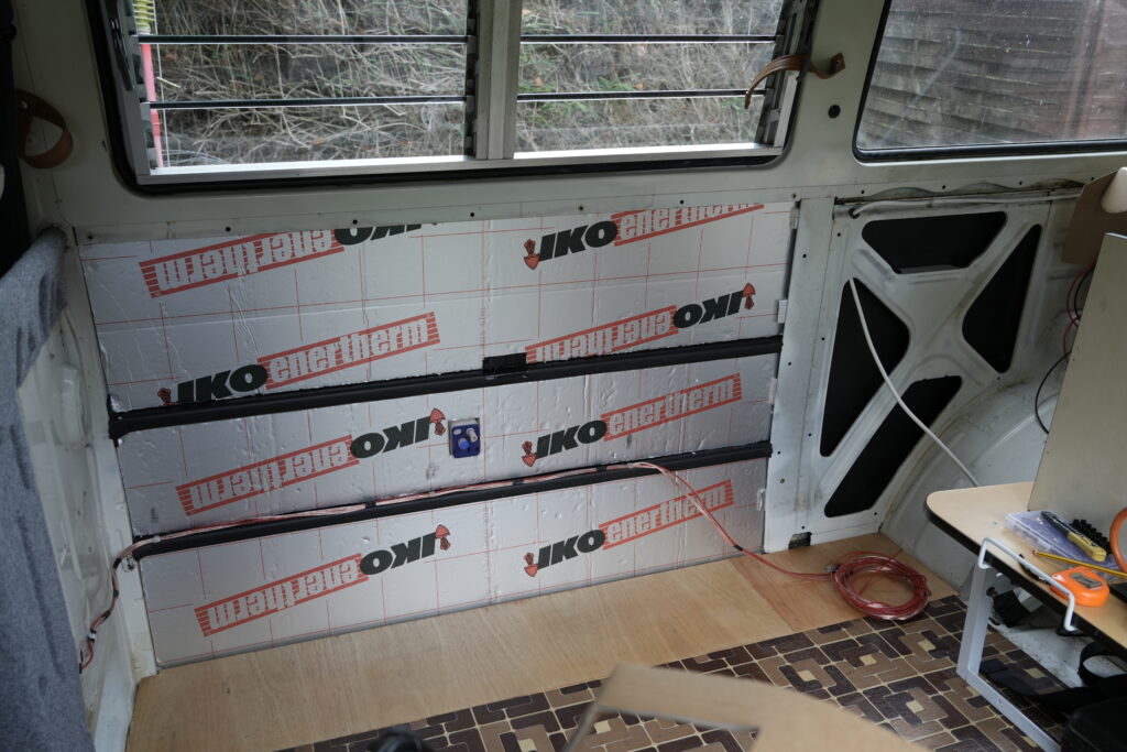 I used Dodo Mat to provide some sound proofing and insulation. It’s closed cell, adhesive and really easy to apply. The basic one is 5mm and was cheap enough to give it a go. Over that, in just the area in the picture, I glued in some 1″ PIR board. A later post will continue with the insulation!